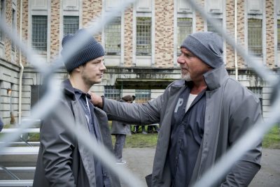 The Flash — “The Elongated Knight Rises” — Image Number: FLA411a_0195b.jpg — Pictured (L-R): Grant Gustin as Barry Allen and Bill Goldberg as Big Sir — Photo: Shane Harvey/The CW — é 2018 The CW Network, LLC. All rights reserved